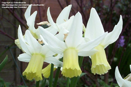 Narcissus 39;Tahiti39; bears softyellow flowers accented by a double cup